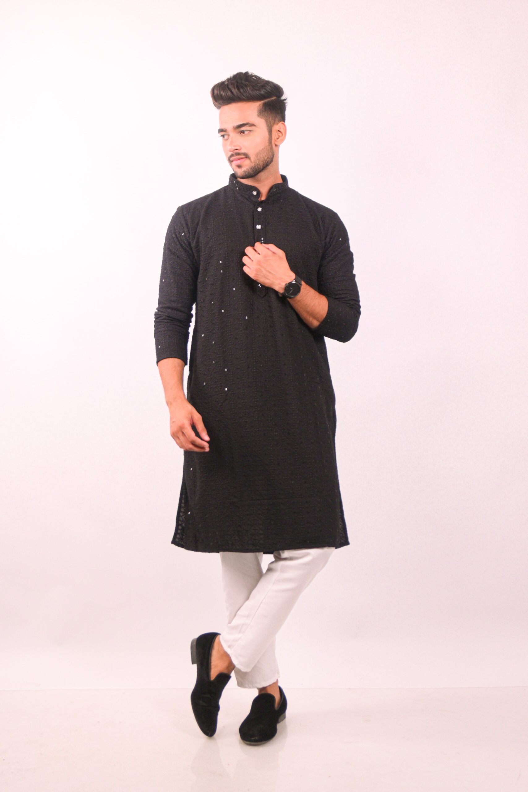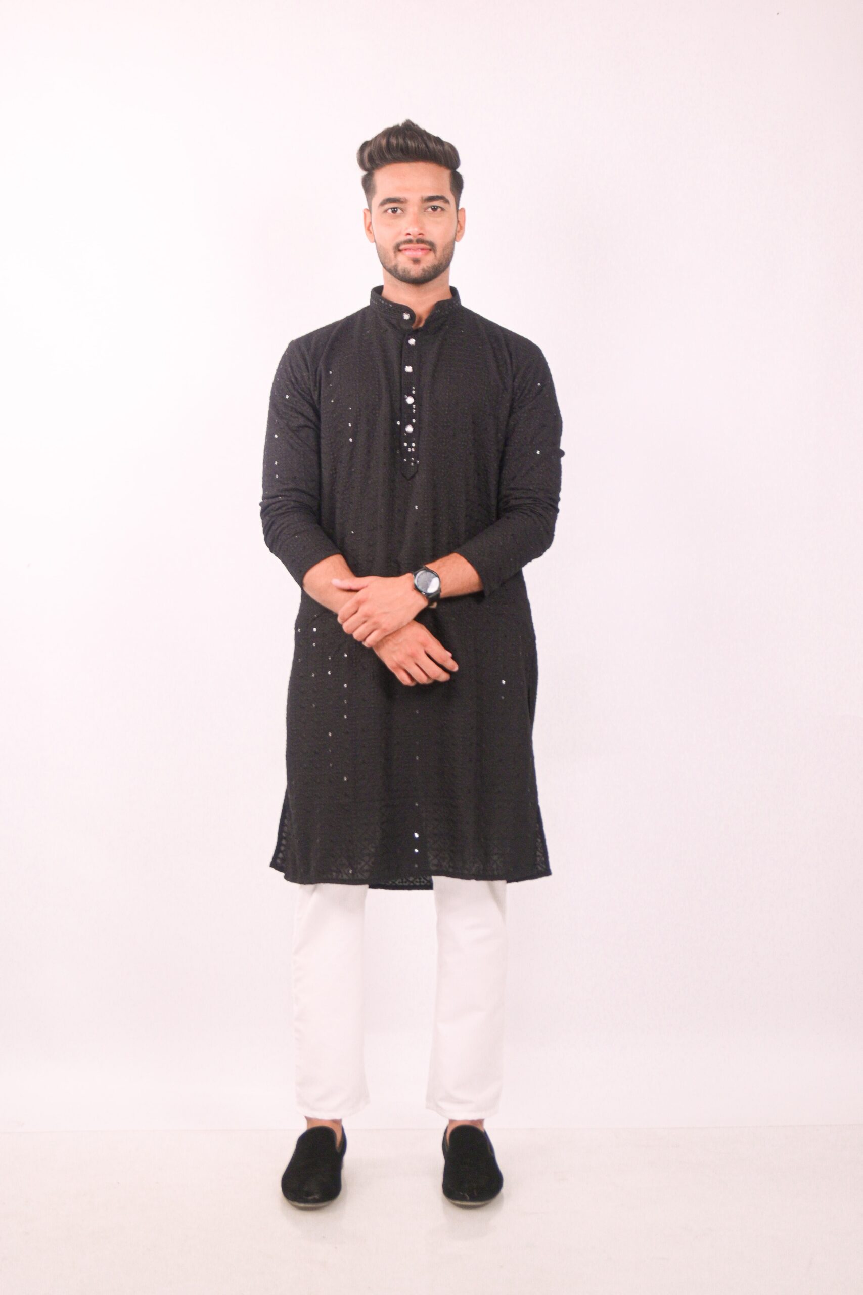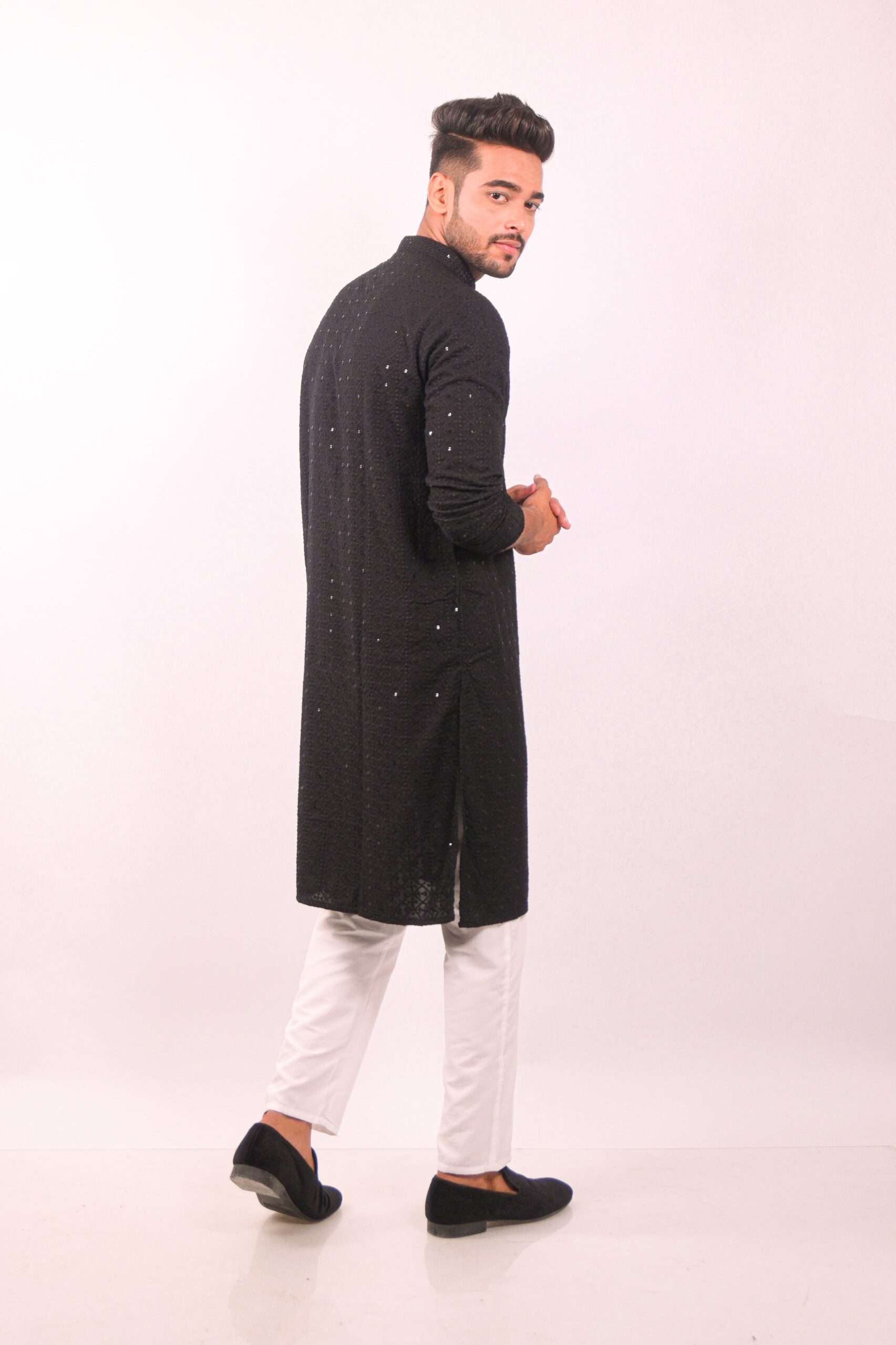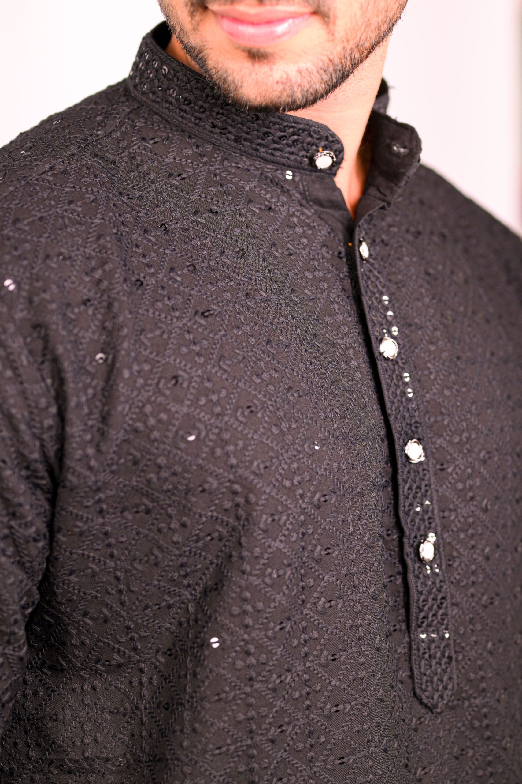 Elegant Black kurta set showcases the timeless beauty of Chikankari embroidery, enhanced with delicate sequin work. The intricate hand-embroidered patterns are a testament to traditional craftsmanship, adding a touch of sophistication to your wardrobe. The kurta is designed for comfort and style, making it ideal for festive occasions, parties, or special events. The subtle sequin embellishments catch the light, providing a subtle shimmer and elevating the overall look.