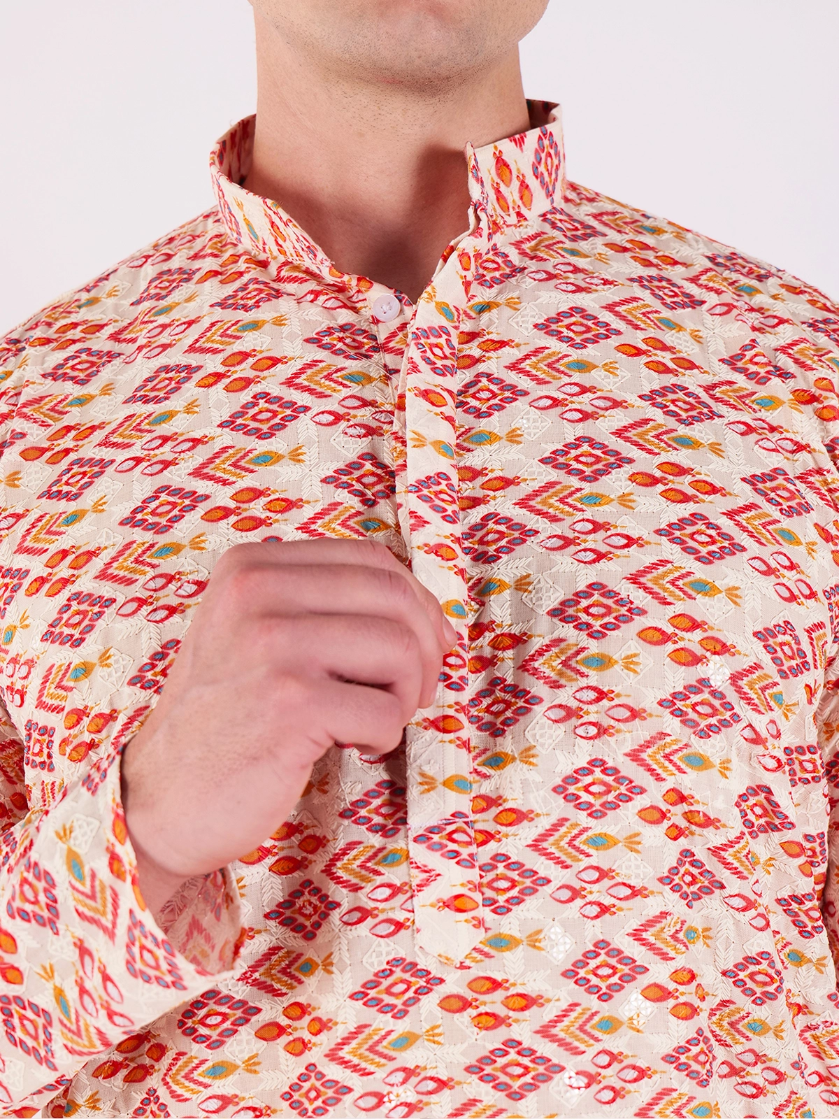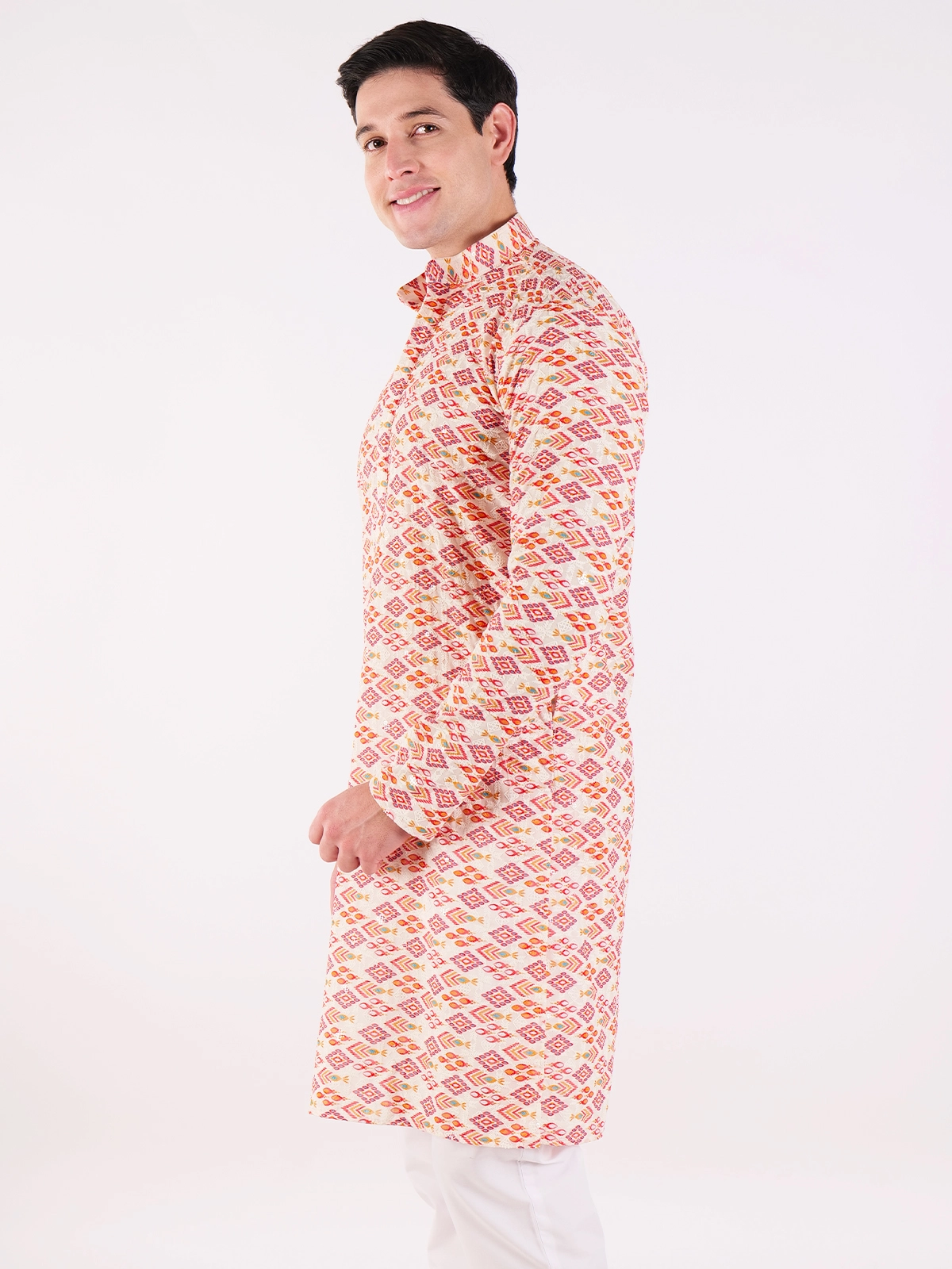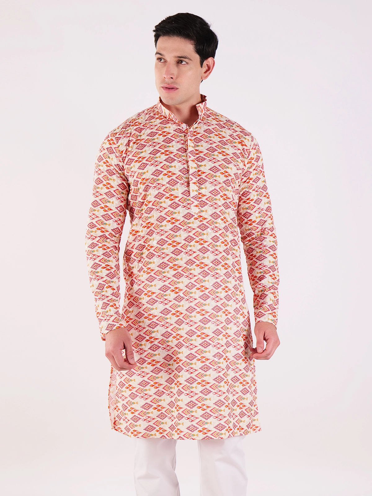 This off-white short kurta features a striking all-over geometric print, showcasing diamond-shaped motifs in a vibrant palette of red, orange, and subtle green. Perfect for adding a touch of personality to your casual wardrobe.