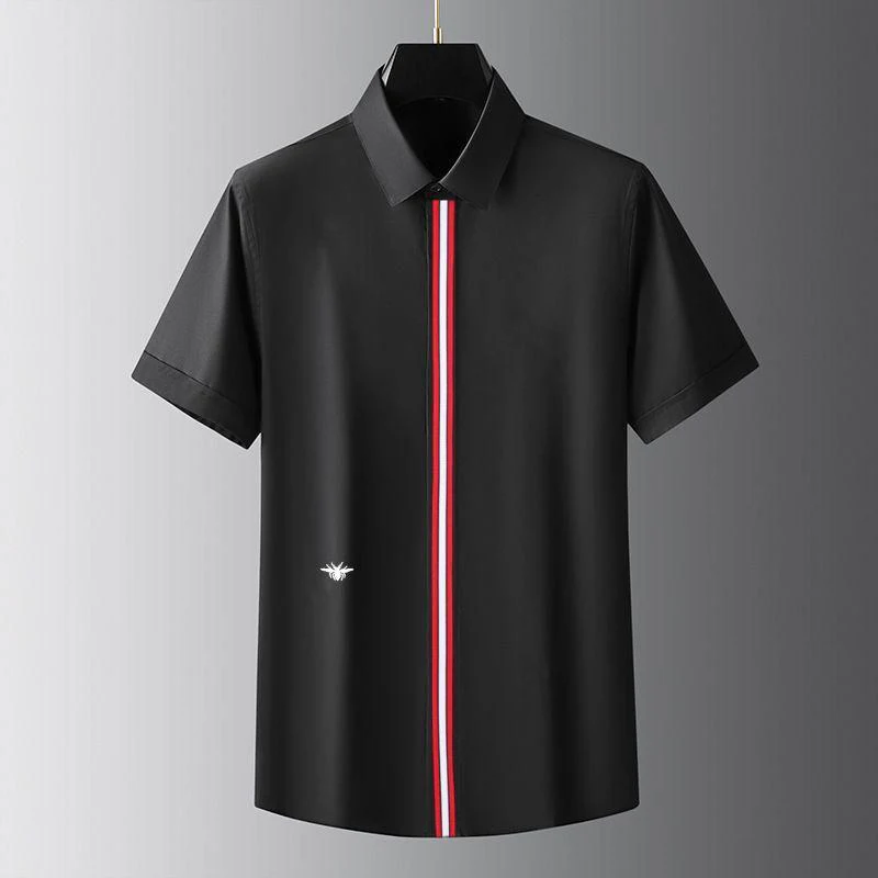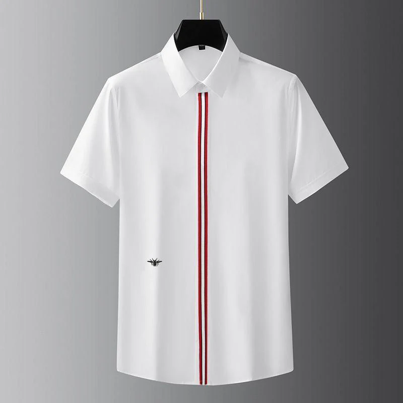 A timeless striped shirt with intricate bee embroidery for a stylish, upscale touch.