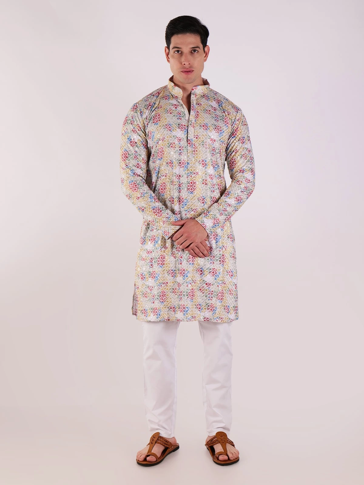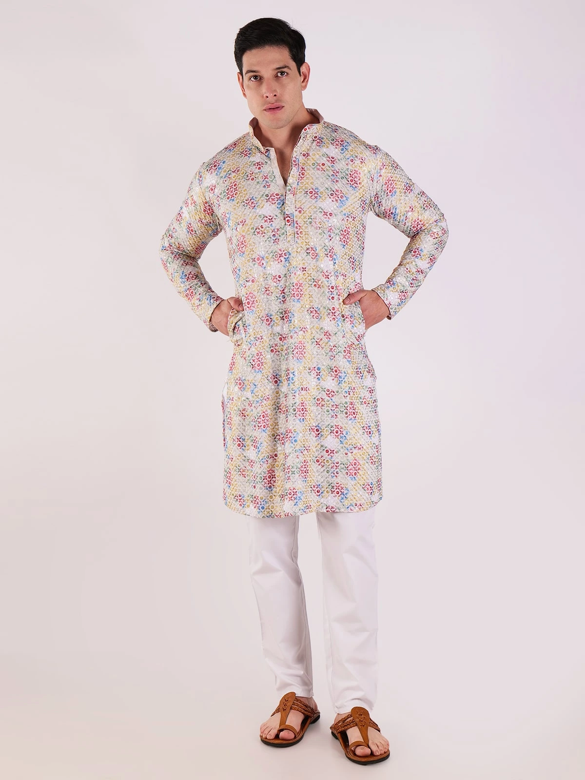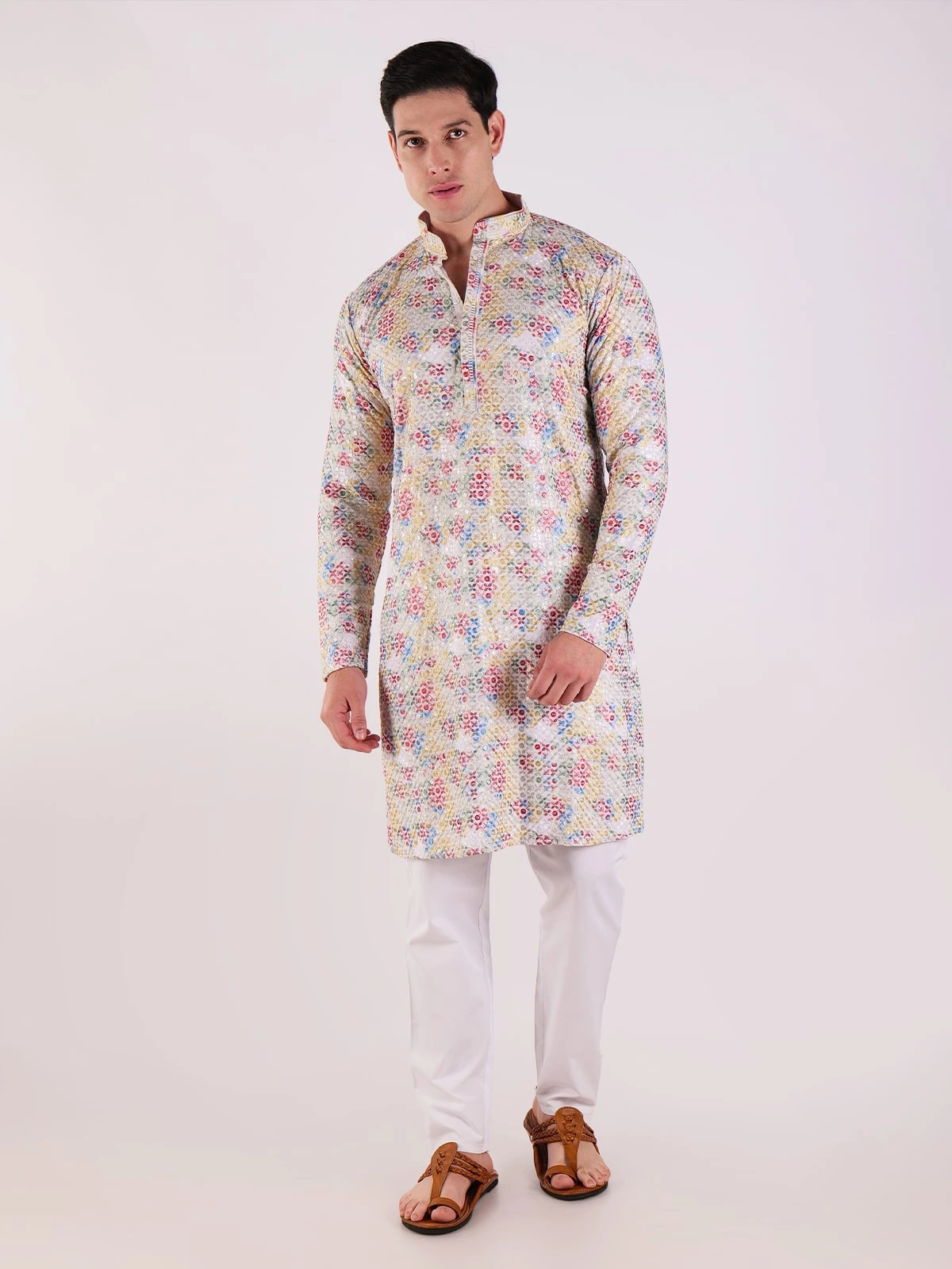 Elevate your ethnic style with this off-white kurta and pant set. Features vibrant resham embroidery in a unique cross and zero game pattern, including yellow, green, red, and blue accents. Premium fabric ensures comfort and a sophisticated look for any festive occasion.