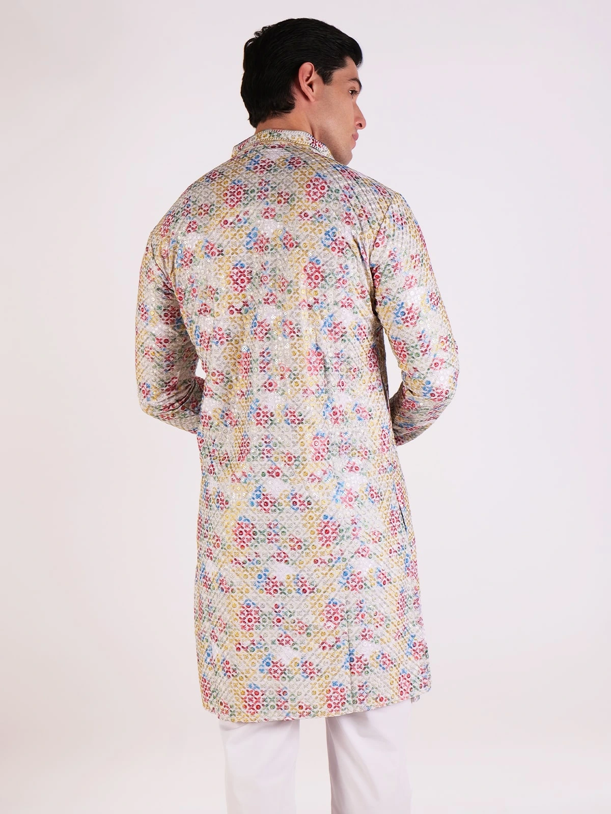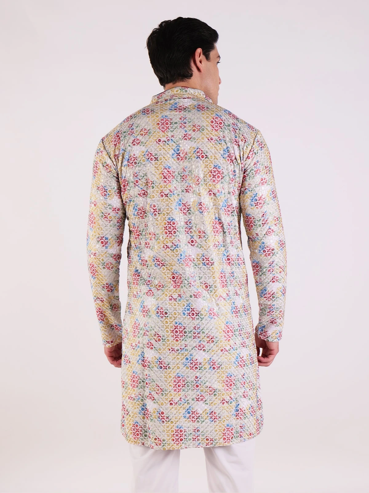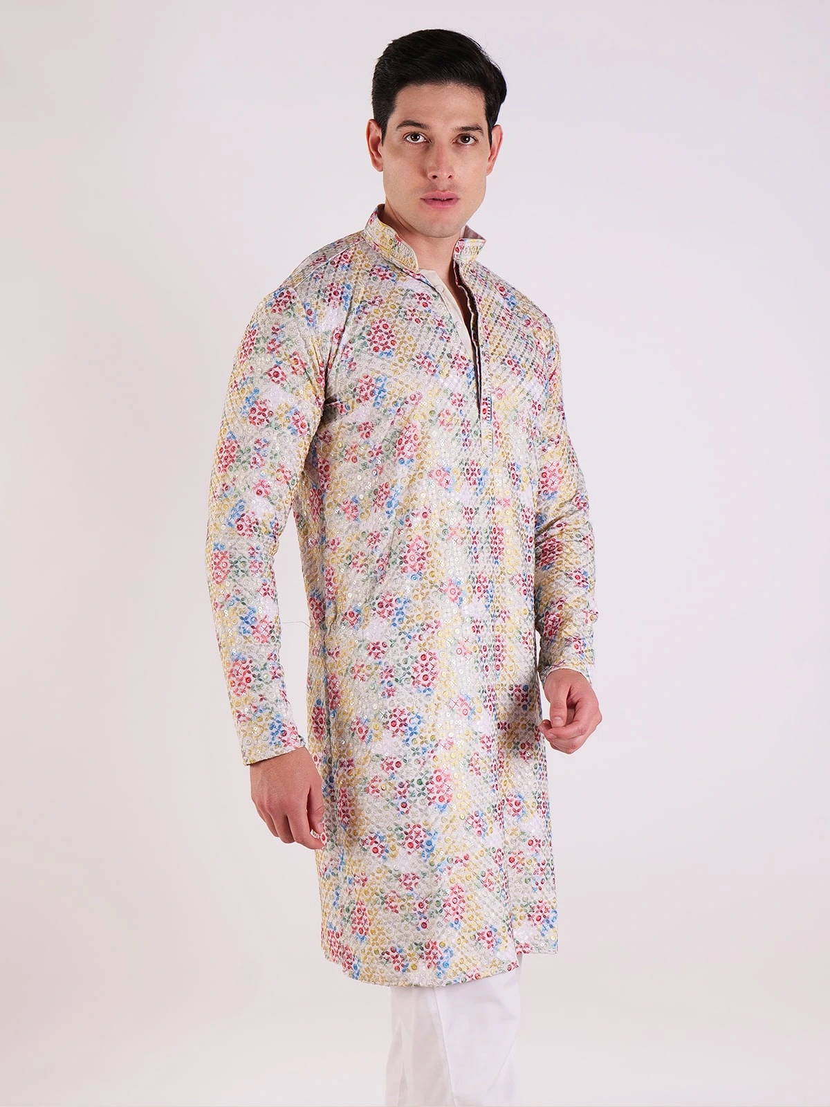 Elevate your ethnic style with this off-white kurta and pant set. Features vibrant resham embroidery in a unique cross and zero game pattern, including yellow, green, red, and blue accents. Premium fabric ensures comfort and a sophisticated look for any festive occasion.