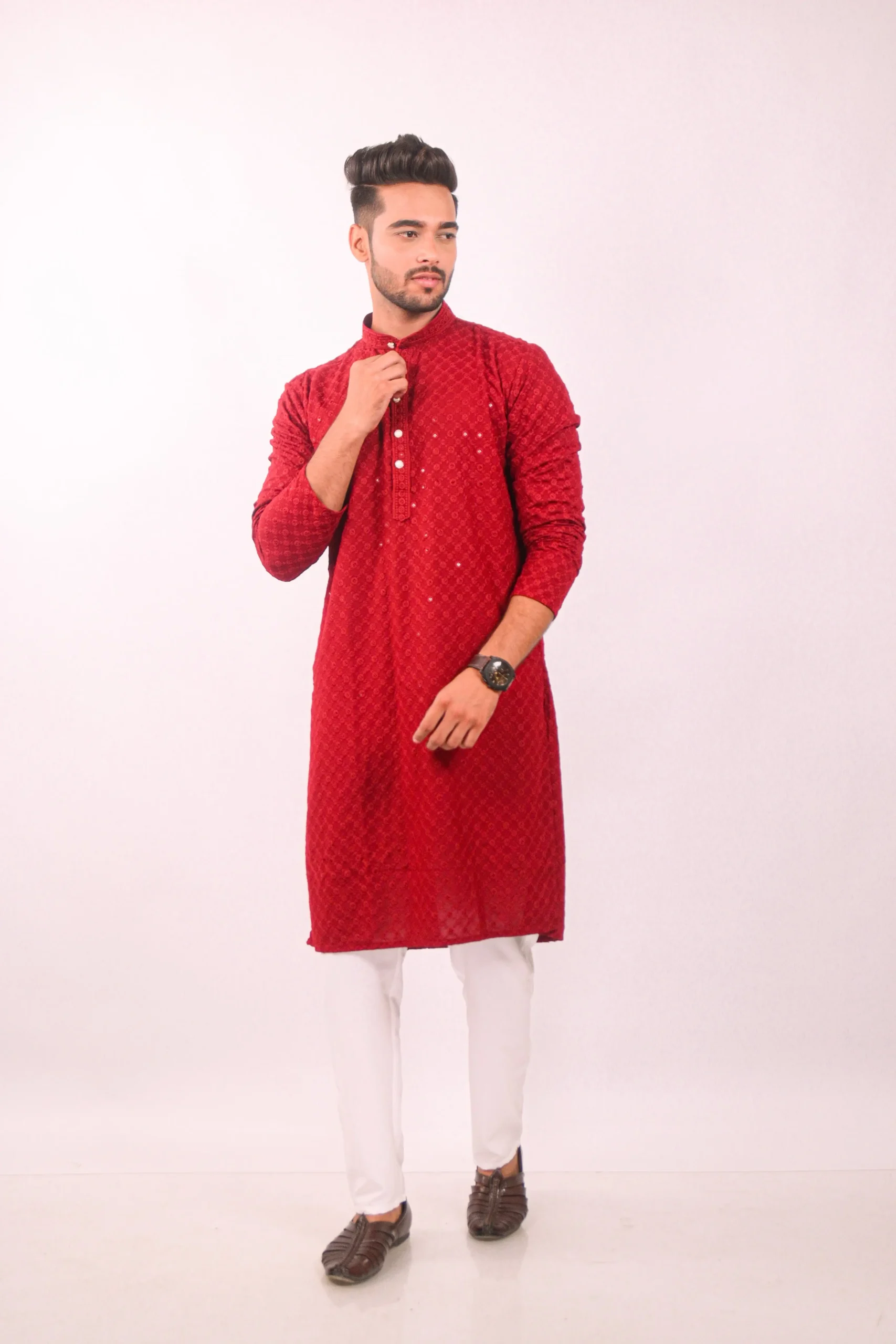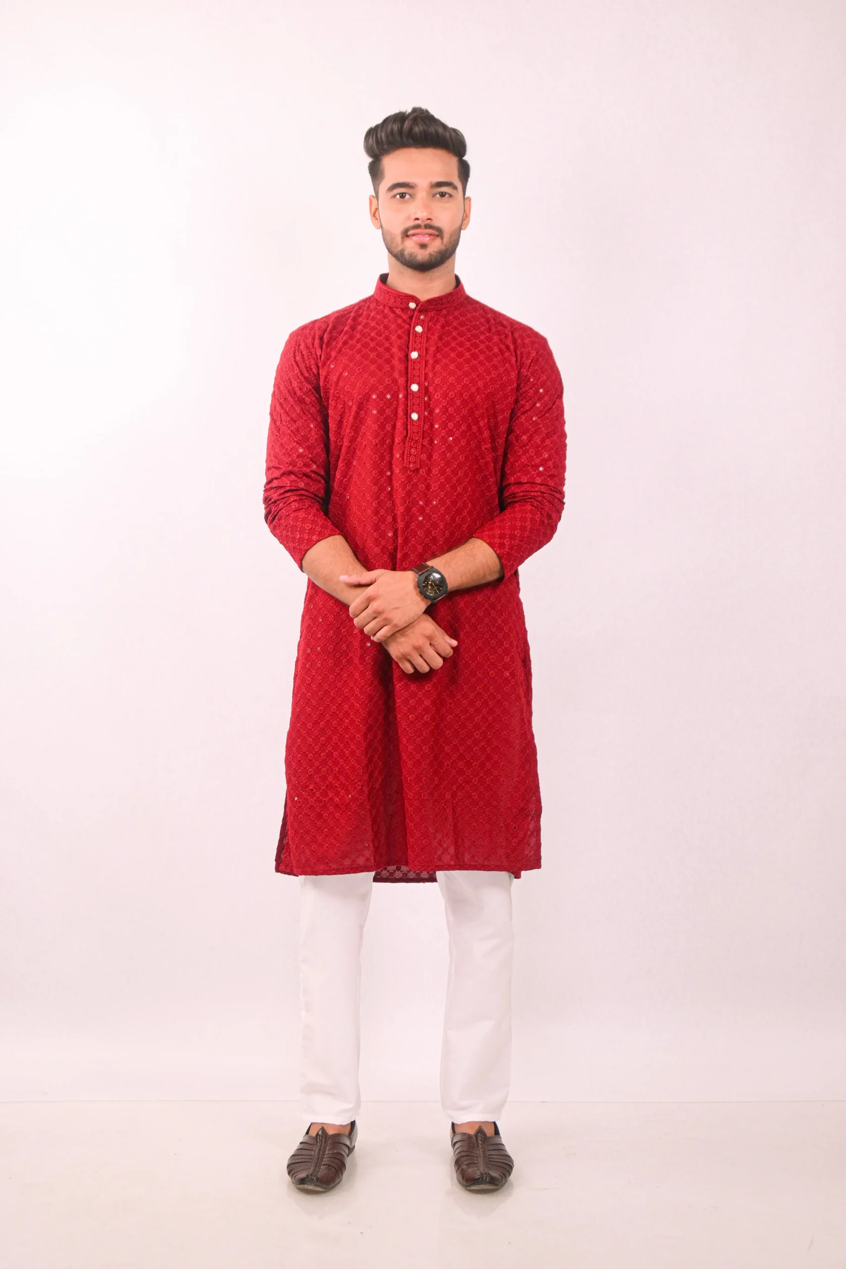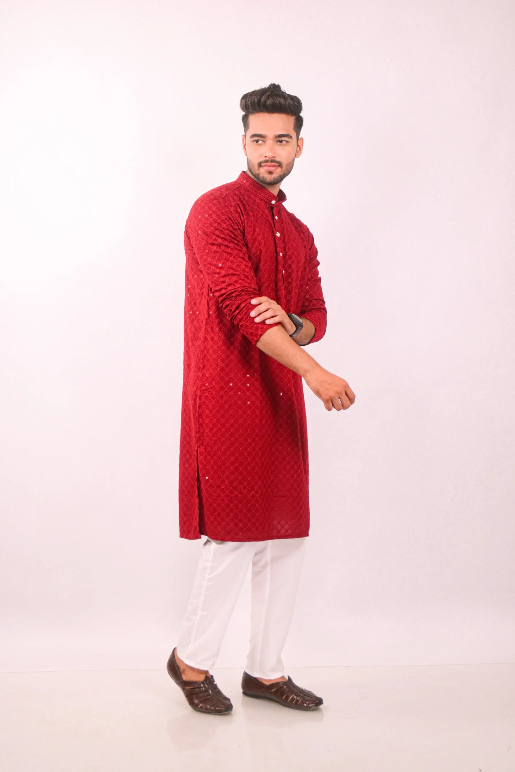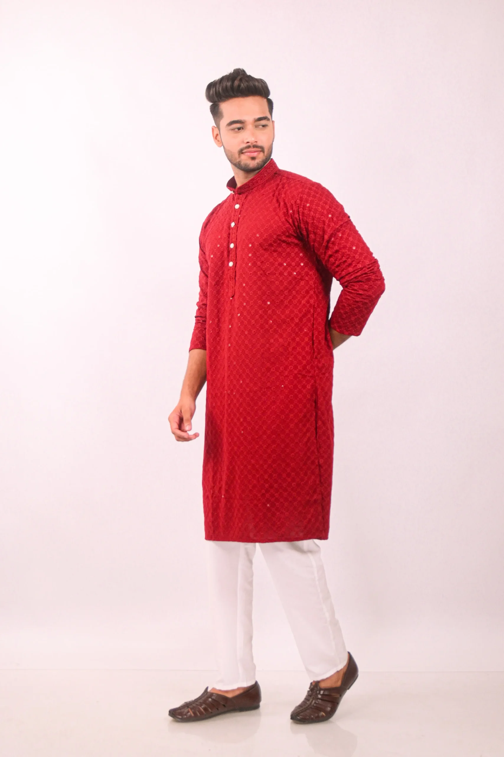 Elegant Red kurta set showcases the timeless beauty of Chikankari embroidery, enhanced with delicate sequin work. The intricate hand-embroidered patterns are a testament to traditional craftsmanship, adding a touch of sophistication to your wardrobe. The kurta is designed for comfort and style, making it ideal for festive occasions, parties, or special events. The subtle sequin embellishments catch the light, providing a subtle shimmer and elevating the overall look.