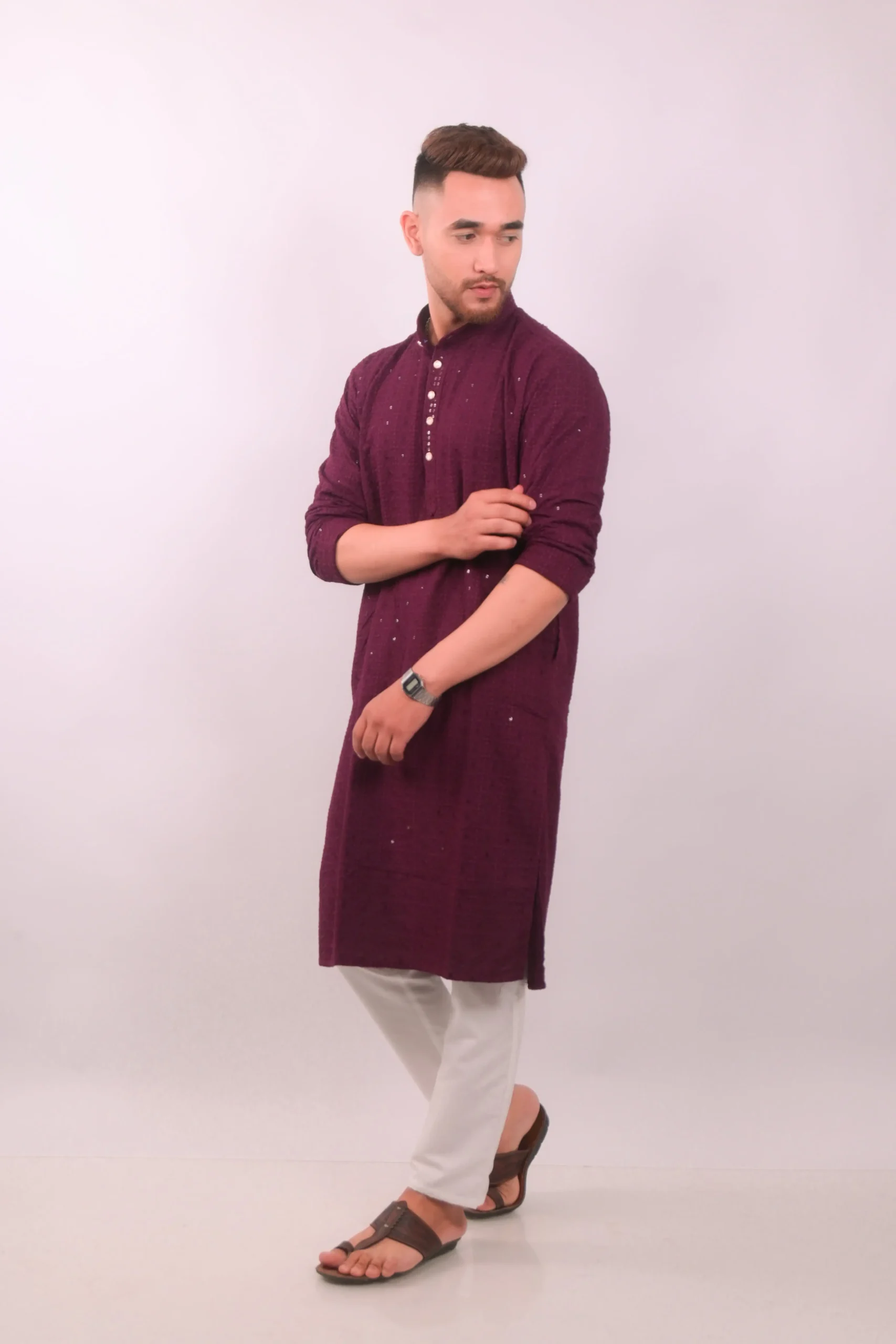 Elegant wine kurta set showcases the timeless beauty of Chikankari embroidery, enhanced with delicate sequin work. The intricate hand-embroidered patterns are a testament to traditional craftsmanship, adding a touch of sophistication to your wardrobe. The kurta is designed for comfort and style, making it ideal for festive occasions, parties, or special events. The subtle sequin embellishments catch the light, providing a subtle shimmer and elevating the overall look.
